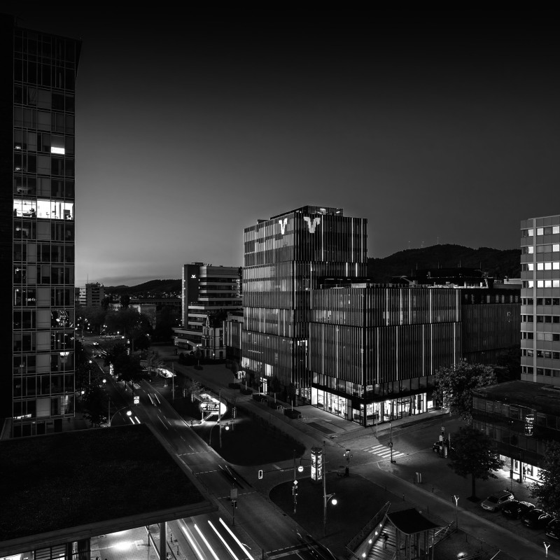 Blick auf ein beleuchtetes Gebäude bei Nacht.